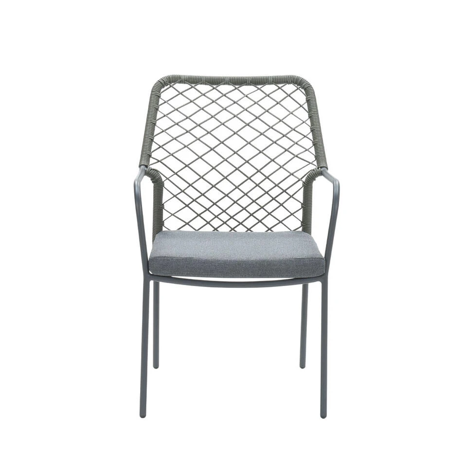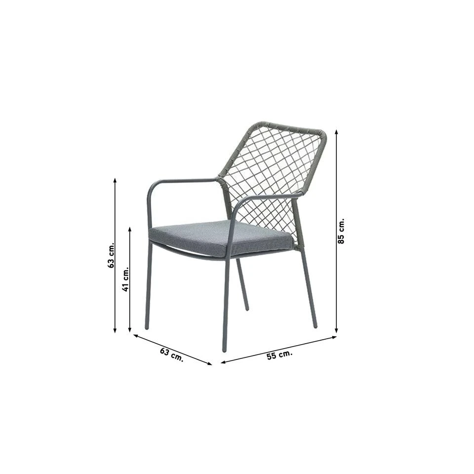 Om dit stevige aluminium frame zit 5 mm dik hoogwaardige kwaliteit kunststof draad. Dit draad heeft een mosgroene kleur en is eenvoudig te reinigen. Het draad heeft de uitstraling van touw, maar is dus gemaakt van TPU wat siliconen is. Hierdoor is dit draad beweegbaar en geeft het een comfortabele steun. Aluminium kan vies zijn geworden door opspattend regenwater of gemorst drinken bijvoorbeeld. Dit is eenvoudig schoon te maken met een sopje en een zachte doek. Het meegeleverde kussen is vervaardigd uit polyester. Het kussen is voorzien van een rits, waardoor de hoes gemakkelijk gewassen kan worden. Het kussen is niet waterbestendig en kan na gebruik worden opgeborgen in een schuur of kussenbox. Het kussen is wel voorzien van een waterafstotende coating. Dit is erg praktisch als er bijvoorbeeld op het kussen wordt gemorst met drinken. Je veegt het vocht er namelijk gemakkelijk weer af.