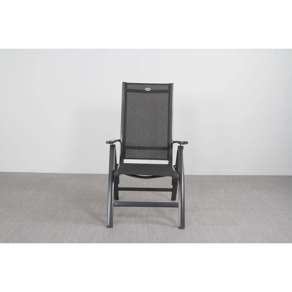 Hartman verstelbare tuinstoel Roma. De stoel heeft een mooie strakke vormgeving en de aluminium armleuning geeft de stoel een stijlvolle uitstraling. Het frame van de stoel is van aluminum en daar tussen is een textileen doek gespannen.