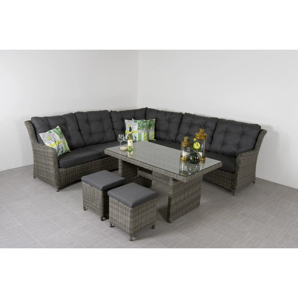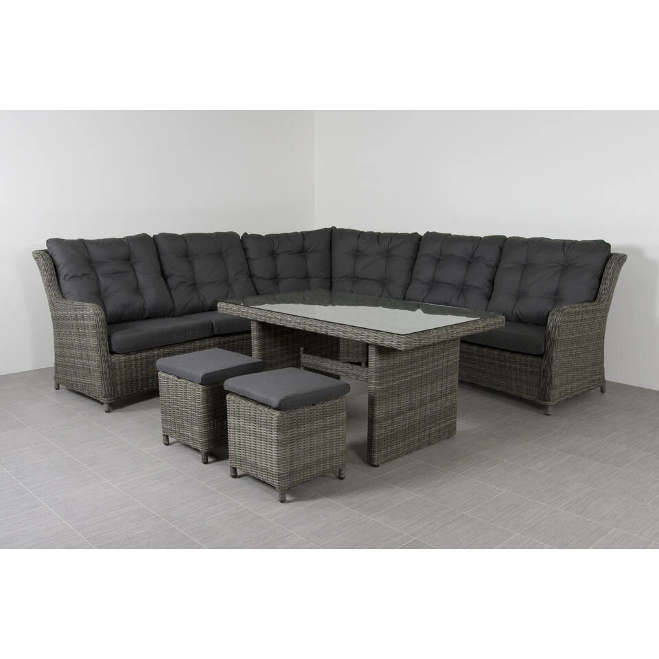 De lounge dining set Richmond is de loungeset die twee werelden in een brengt. De dining loungeset is een echte loungeset maar geeft ook de mogelijkheden om te dineren in de set. Dit komt door de hoge loungetafel. De set heeft een lekkere hoge rugleuning wat ervoor zorgt dat je veel steun in de rug hebt. De rugkussens zijn gecapitonneerd, dit geeft de richmond lounge dining set een luxe uitstraling. Het XL hoekelement zorgt voor een extra zitplaats in de bank. De leuke bijzetkrukjes zijn geschikt als zitplaats maar ook te gebruiken als voetenbankje.